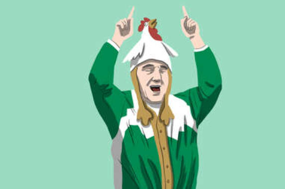 while proudly displaying his index fingers. Many have noted that he looks uncannily like Will Ferrell. The significance of the chicken hat